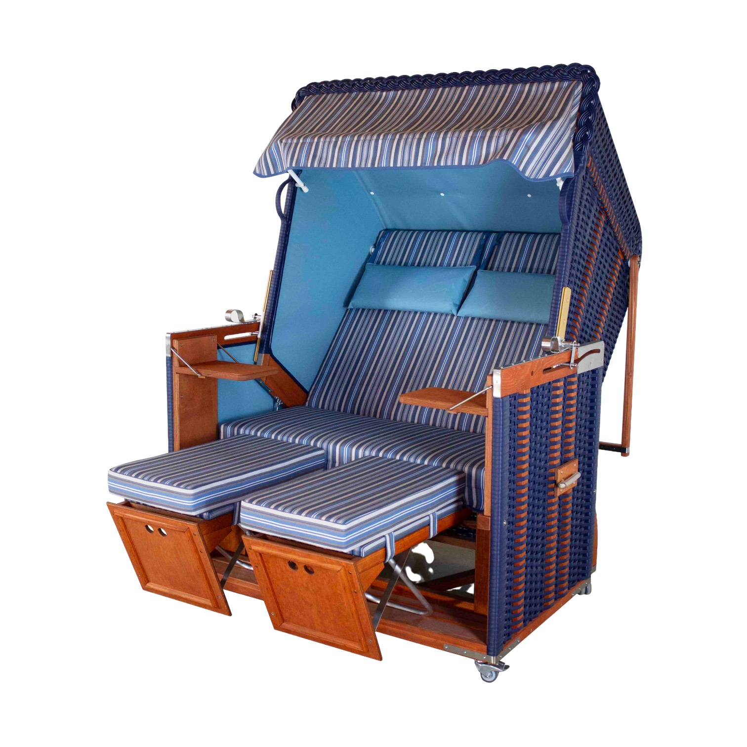 Der blau-gestreifte Bezugsstoff passt wie die Faust aufs Auge, so dass es auch bei genauerer Betrachtung nie langweilig wird. Die dicken Fußpolster und die Nackenkissen sorgen dabei für den Wohlfühlmoment.