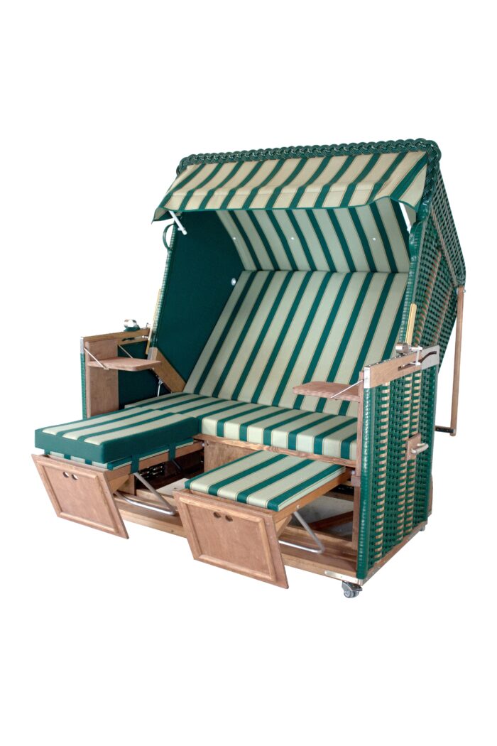 Der klassische Ostseezopf schließt die Korbhaube ab und akzentuiert die Sonnenblende dieses eleganten Strandkorbes.