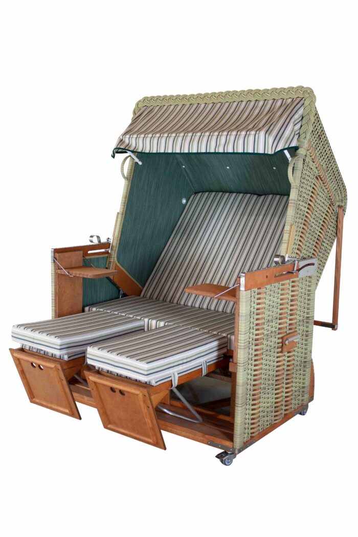 Der klassische Ostseezopf schließt die Korbhaube ab und akzentuiert die Sonnenblende dieses eleganten Strandkorbes.